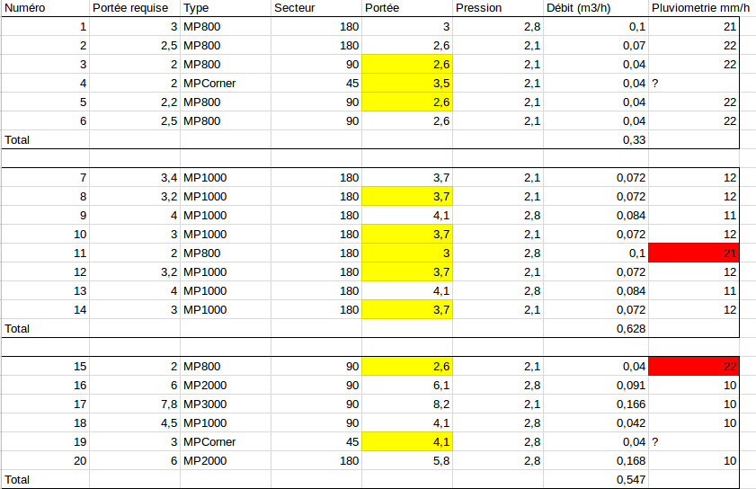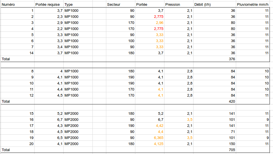 Ne mélangez pas sur le même réseau des arroseurs MP 1000 avec des MP 2000 ou des MP 3000, conservez une homogénéité des buses sur une même canalisation (quoi qu'en dise le fabricant). A la limite MP 800/1000 et Corner (bien que la pluviométrie soit bien différente), mais MP 1000 et 3000 donne un résultat très décevant voir mauvais.