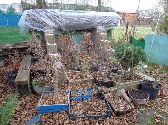 Bonsoir, voila une autre partie de mes bonsaï mais eux en caisse de culture. Ils supportent mieux le froid car ils ne sont pas dans de petit pot et ont une protection de feuillage tout au tour de leur caisse.