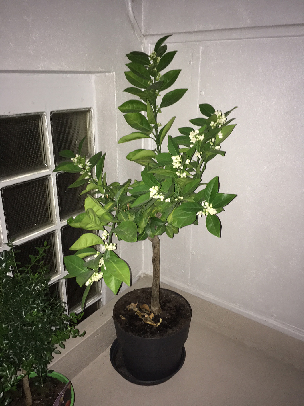 L'année 2017 a été pour lui difficile, il a perdu toutes ses feuilles (je l'avais pourtant mis à l'abri du froid, dans les parties communes de mon immeuble) il n'a pas fait de fleurs, et à l'été, tentant le tout pour le tout, j'ai coupé ras toutes les branches qui repartait du tronc.