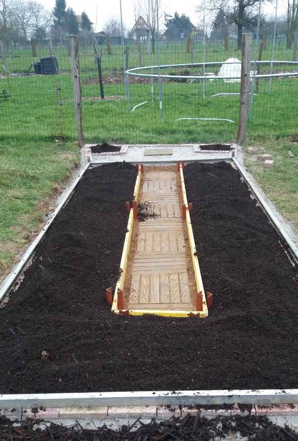 Puis j'ai posé des planches de coffrage pour délimiter mon allée centrale et retenir la terre de plantation. Et au milieu j'ai posé des caillebotis.