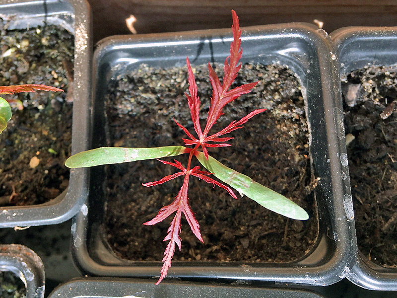 Les trois 'loustics' témoignent d'une hybridation particulière, probablement avec un Acer dissectum , voir peut être linearilobum; les cotylédons sont très allongés, les pousses sont rouges et finement découpées. Cela donnera des sujets très intéressants. Il faut attendre que cette apparence se confirme .