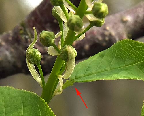 Je ne devais pas être réveillé d'ailleurs, car il aurait suffi que je lise la description que j'ai moi même écrite pour cet arbre, qui précise qu'il y a deux glandes caractéristiques à la base du limbe, à la limite du pétiole, sur chaque feuille, comme indiqué par cette flèche :