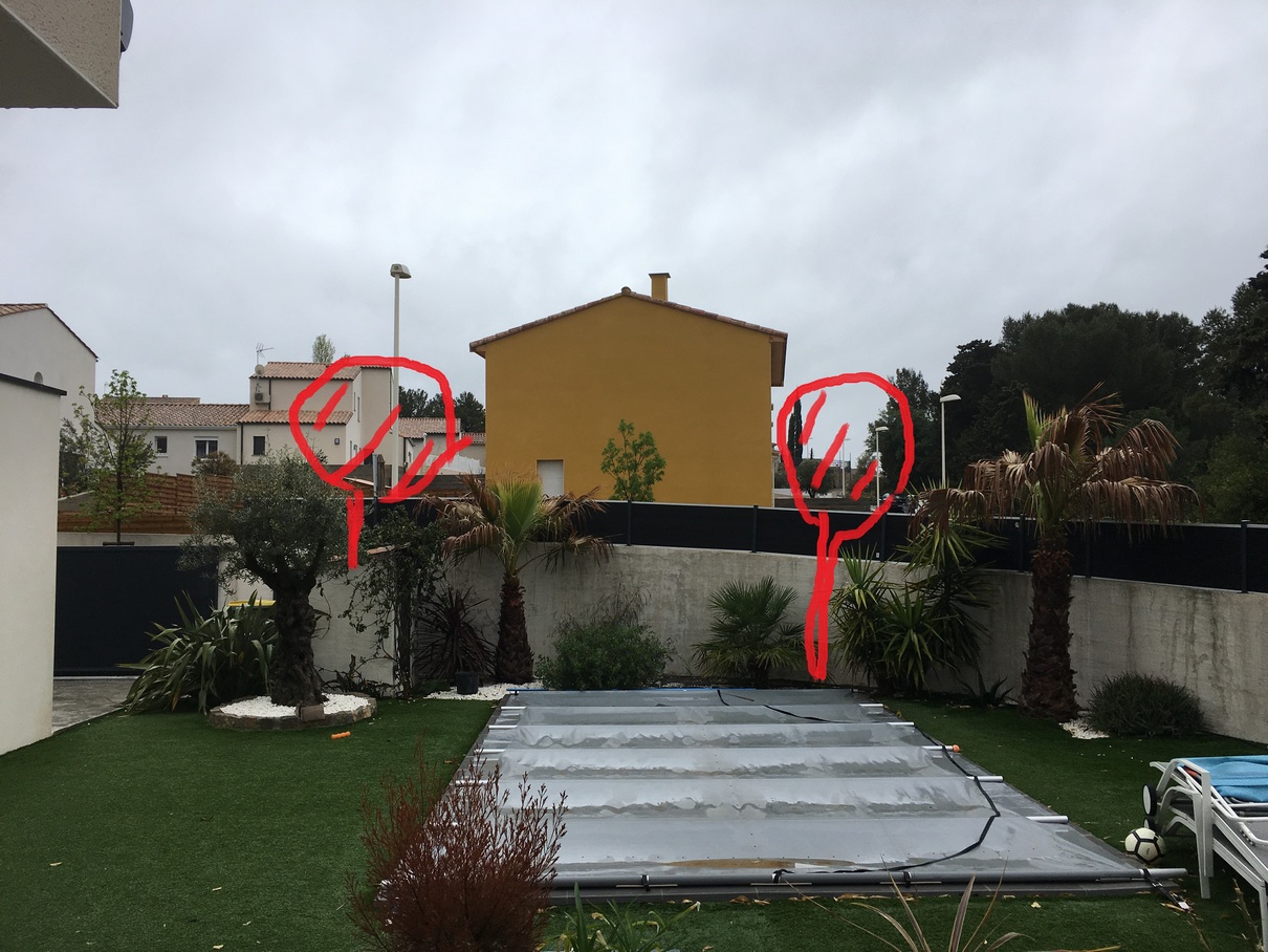 Nous souhaitons ne plus voir les maisons qui font face à la notre. Notre mur de clôture est à 2,5 m. et un/des arbres serait préférable. Dans un premier temps, nous pensions aux bambous mais il faudrait supprimer nos plantations existantes ! Des arbres avec un tronc assez haut nous permettrait de garder notre végétation au sol et nous espérons une hauteur de 3,5 à 5 mètres de haut .... (Sempervirents serait mieux)