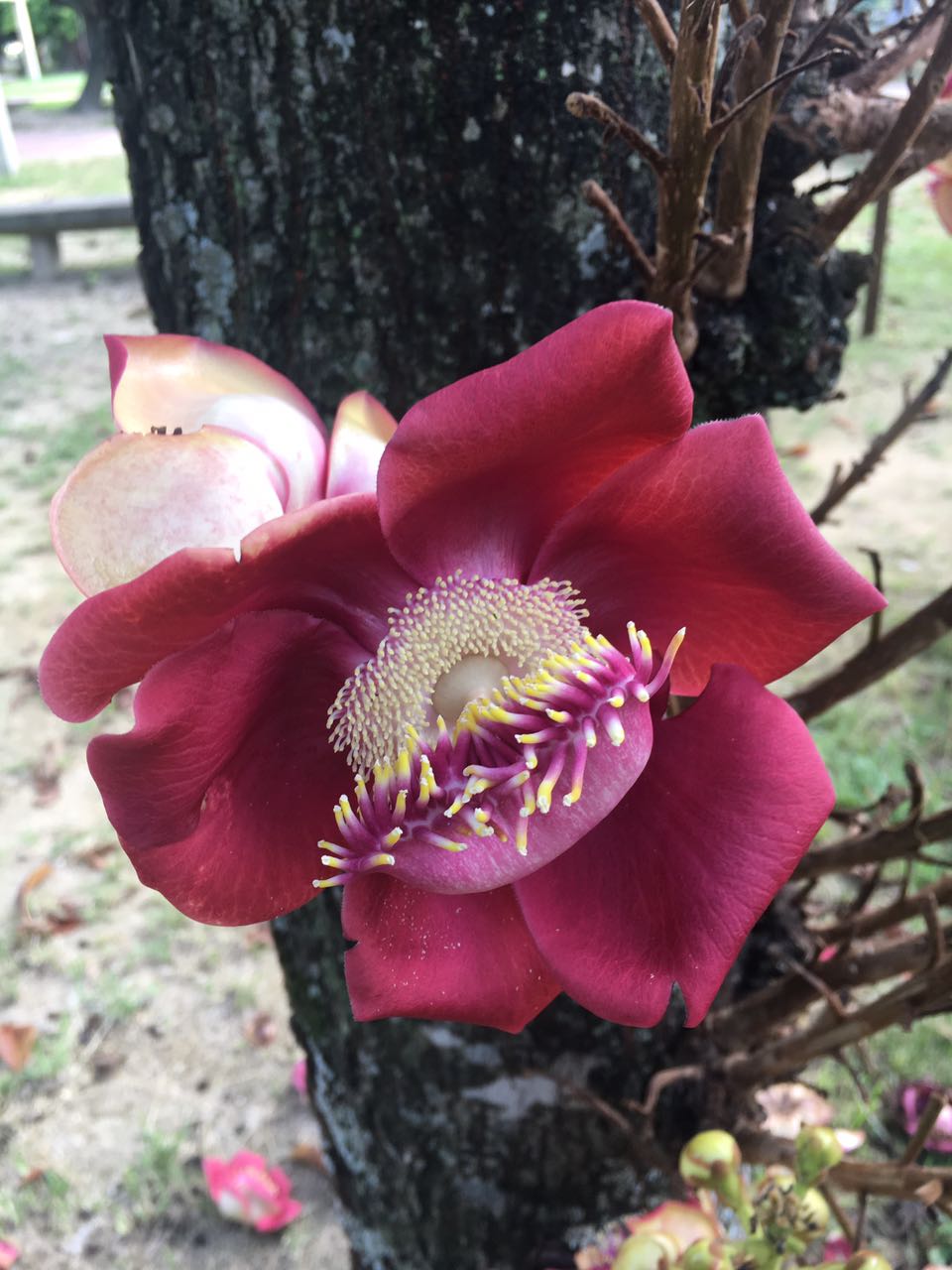 fleur de "boulet de canon" ou "abrico de macaco". Les fruits ressemblent à des boulets de canon, il faut mieux ne pas rester sous l'arbre !