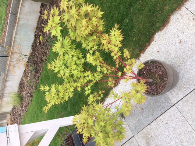 Cela fera 1 an au mois de mai qu'il est planté dans ce pot et sur les conseils de opusoculi, j'ai donc acheté de l'engrais liquide avec pour composition 3-5-7 contenant des oligo-éléments afin de nourrir mes arbres en pot dont cet érable.