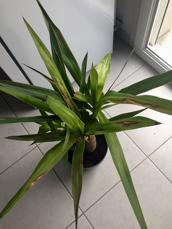 Depuis quelques jours des tâches plus ou moins importantes sont apparues sur les feuilles de mon yucca et je n'arrive pas à trouver ce que c'est.