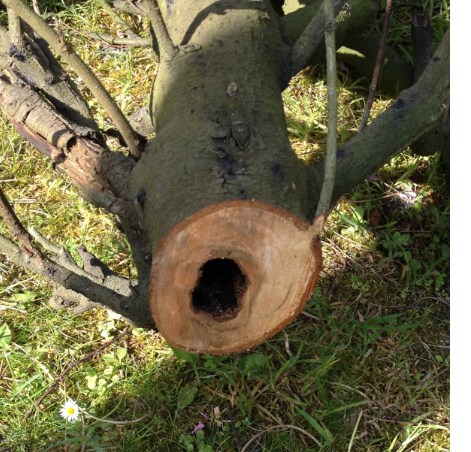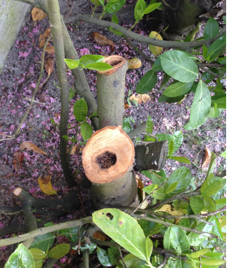 Par contre le 3ieme laurier était totalement "cramé", du coup je l'ai coupé à 30 cm du sol, et j'ai constaté un trou dans le tronc !