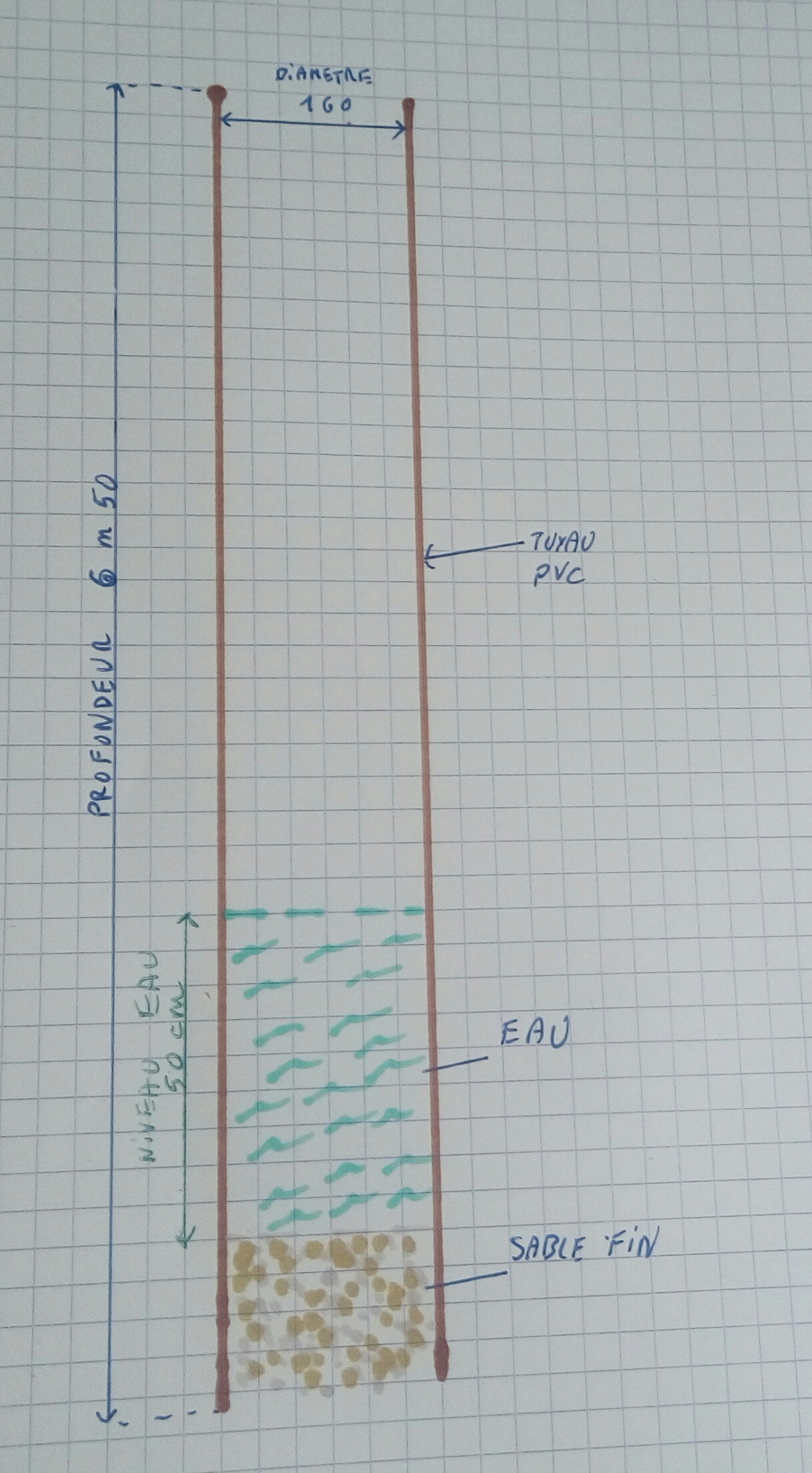 bonjour après forage avec tarière d un puit de 7m de profondeur et 160 mm de diamètre, je l ai tubé avec un tube pvc de diamètre 160mm, (schéma si joint).