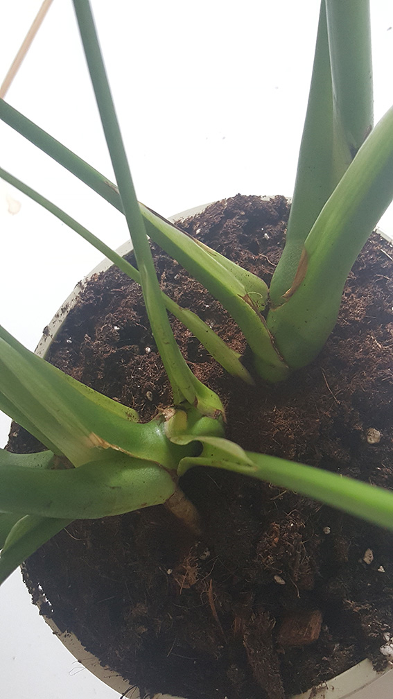 J'avais lu pas mal de choses sur la sécheresse de l'air, et j'avais rapidement remédié à cela en brumisant très régulièrement et en mettant des billes d'argiles humides. Mais cela continue... Cela ne me semble pas suffisant malheureusement. D'ailleurs, quand je coupe les pointes noires, cela revient aussi sec (sans mauvais jeu de mots!). C'est franchement rapide! De plus, comme on peut le voir sur les photos, la "naissance" des nouvelles feuilles, à la base de la tige, près des racines, est également atteinte par ce noircissement/dessèchement...