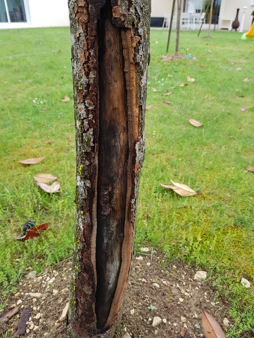 Il a été planté il y a bientôt 10 ans, voici les photos ci dessous, en bas du tronc, l'écorce s'ouvre et on voit que cela va continuer en montant, pour le moment on a rien fait, on a peur de le perdre.