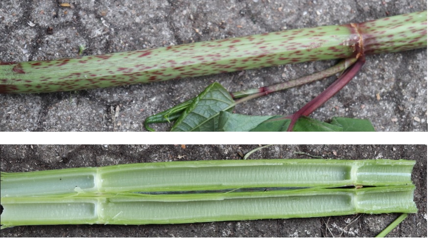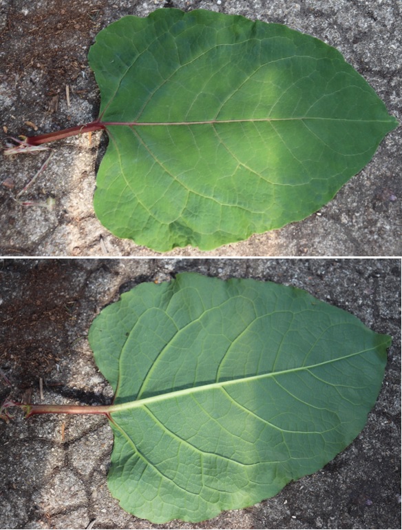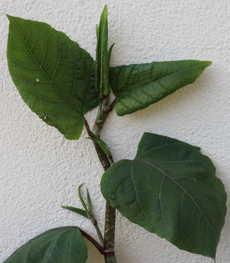 Pouvez-vous identifier cette plante qui pousse sur mon terrain et surtout sur le terrain de mes voisins svp ? Je pense à Fallopia japonica implantée en bordure de rivière à quelques kilomètres d'ici. La longueur de la feuille sans le pétiole est de 17 cm. Merci.