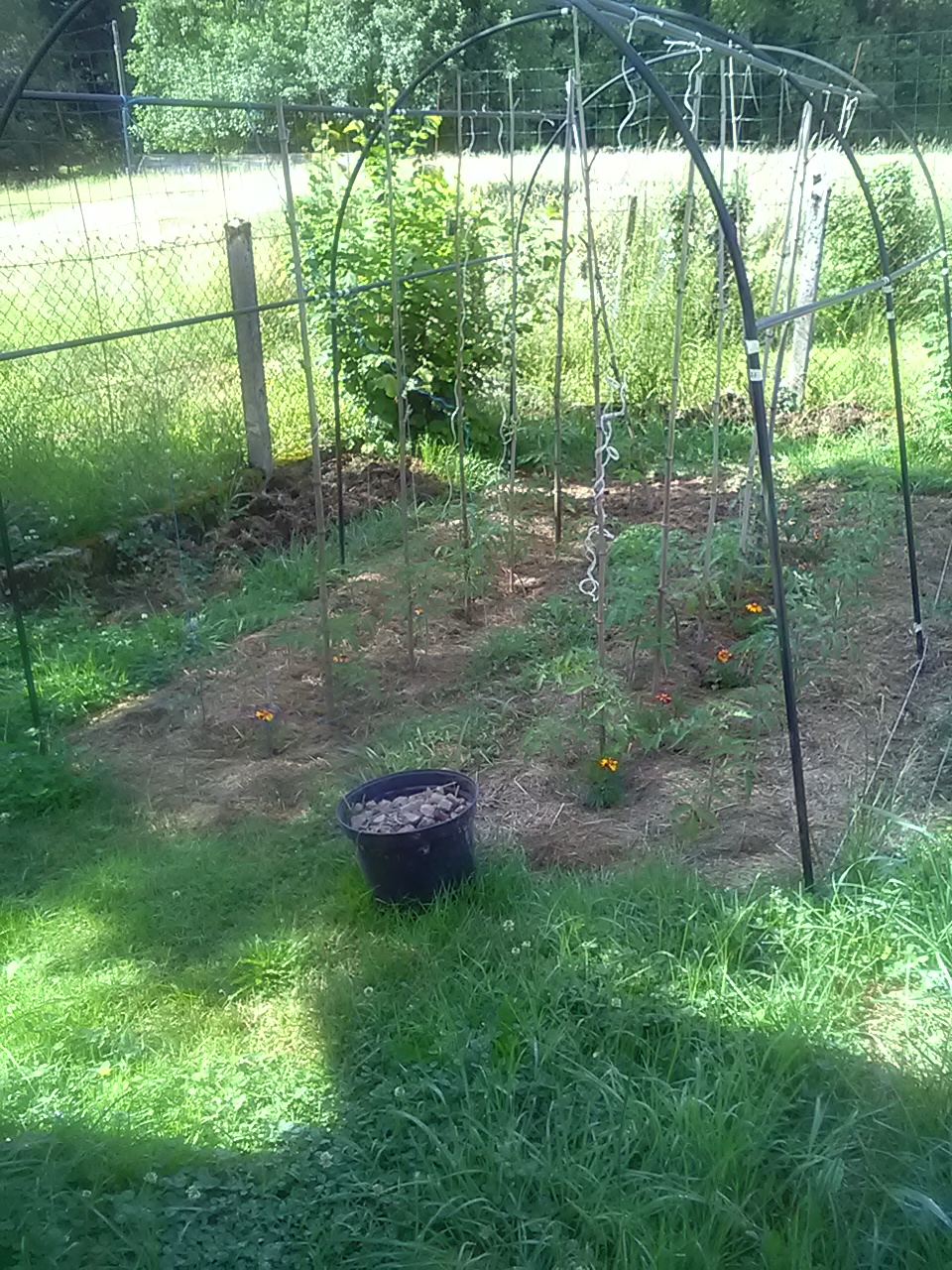 Je suis claquée alors que le terrain était quasi prêt: je n'avais qu'à prendre les mesures, faire les trous, mettre les tuteurs ou ficelles... Bon j'ai aussi apporté du terreau/compost mais seulement pour les 2 premiers rangs. Après j'ai pensé que c'était inutile : la terre a l'air belle. Et j'ai arrosé et repaillé.