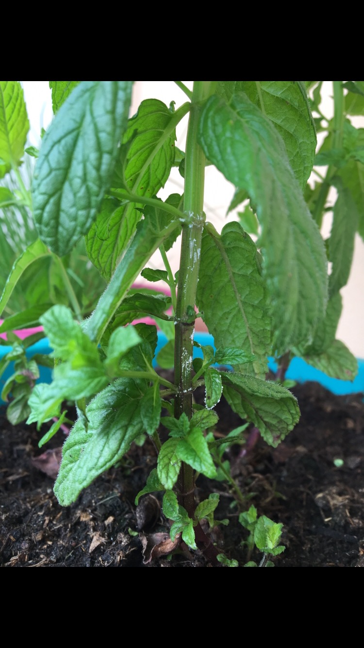 Je fais pousser de la menthe en pot sur mon balcon. J'ai acheté un pied en jardinerie et l'ai repiqué il y a environ 15 jours. La menthe s'est déjà bien développée, mais en coupant les feuilles fanées ce matin j'ai remarqué des traces blanches sur une des tiges principales, en bas, et cela commence à s'étendre sur quelques feuilles. Pouvez-vous me dire ce que c'est et comment le traiter?