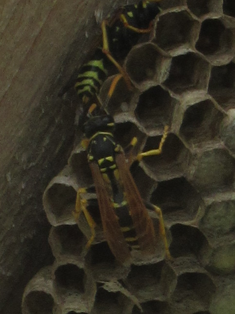 Ce sont donc des guêpes polistes, j'ai regardé sur le net, ça correspond bien et vu le bazar que j'ai fait ce matin avec la bâche, elles n'ont pas été agressives.