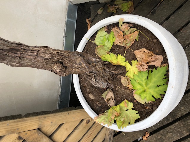 Autre raison : le pot est beaucoup trop petit pour la taille de ce pied de vigne, il faudrait au minimum multiplier sa taille par 4 ou 5 pour que le pied de vigne est suffisamment de terre pour vivre.