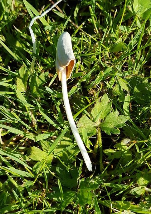 Je suis tombé ce matin sur ces petits champignons, une dizaine, disséminés sur la pelouse. Il n'y a pas d'arbre à proximité, sauf peut-être un jeune figuier. Ils ne mesurent pas plus de 7 cm de haut et ont tous la même apparence. C'est moi qui ai déchiré le chapeau pour mieux voir l'intérieur.