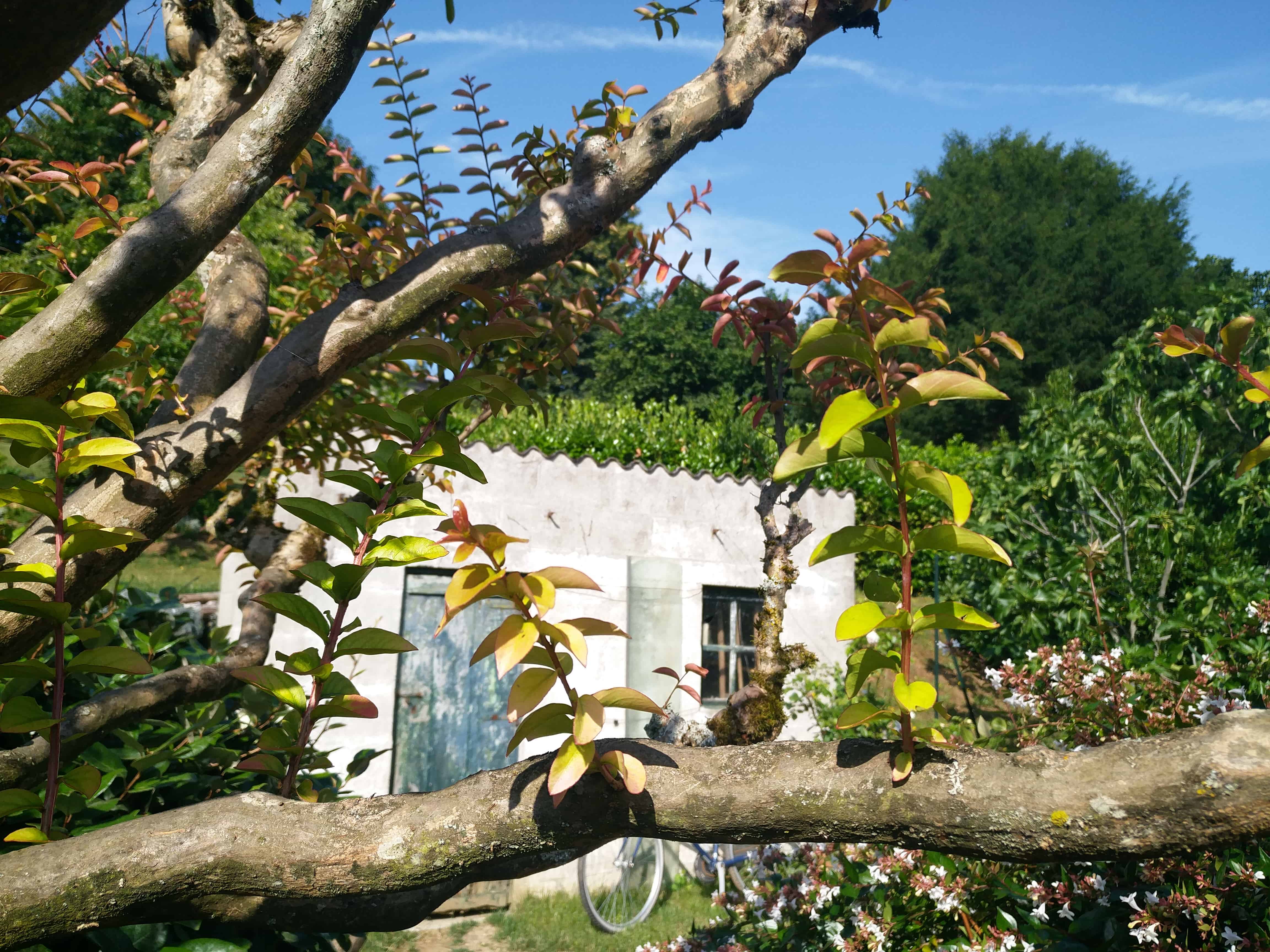 Avis tout personnel: je ne comprends pas qu'un paysagiste puisse ensevelir un tronc d'arbre, et en plus assurer que cela n'aura aucune conséquence fâcheuse. Un Lagerstroemia possède des racines qui sont faites pour demeurer sous terre, un tronc et des branches faits pour être à l'air libre. Je ne vois pas bien la partie qui été enterrée mais le risque est que cela fasse pourrir le tronc à terme, l'écorce ne peut pas supporter une stagnation d'eau continue. Et quand on voit le printemps humide qu'on a eu...