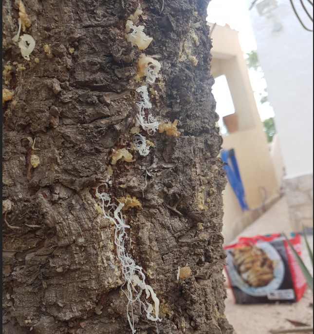 le tronc présente une crevasse et de la sève/résine en sort.