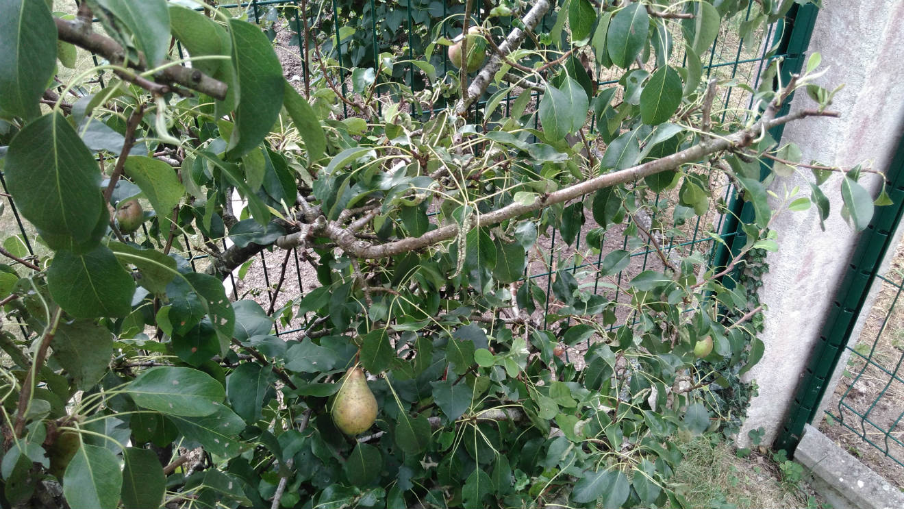 cette année j'ai décidé de couper pas mal de branches au poirier et coïncidence ou pas, j'ai eu plein de poires (par groupe de 3 ou 4), quand j'ai vu qu'elles ne grossissaient pas, j'ai décidé d'en sacrifier quelques unes pour que les autres poussent mieux, entre temps, certaines sont tombées, d'autres sont devenues marron ou mangées par les oiseaux.