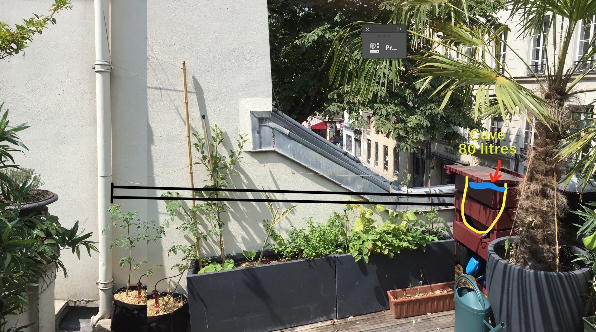 Sur les photos ci jointes vous pourrez voir que la réserve n'est pas loin de la gouttière, seulement j'aimerais bien savoir quel produit acheter pour poser sur la gouttière, à quel hauteur le poser, mon plan dessiné pourrait-il fonctionner ? Ou passe le trop plein ? Ou percer la cuve pour l'arrivée d'eau ?