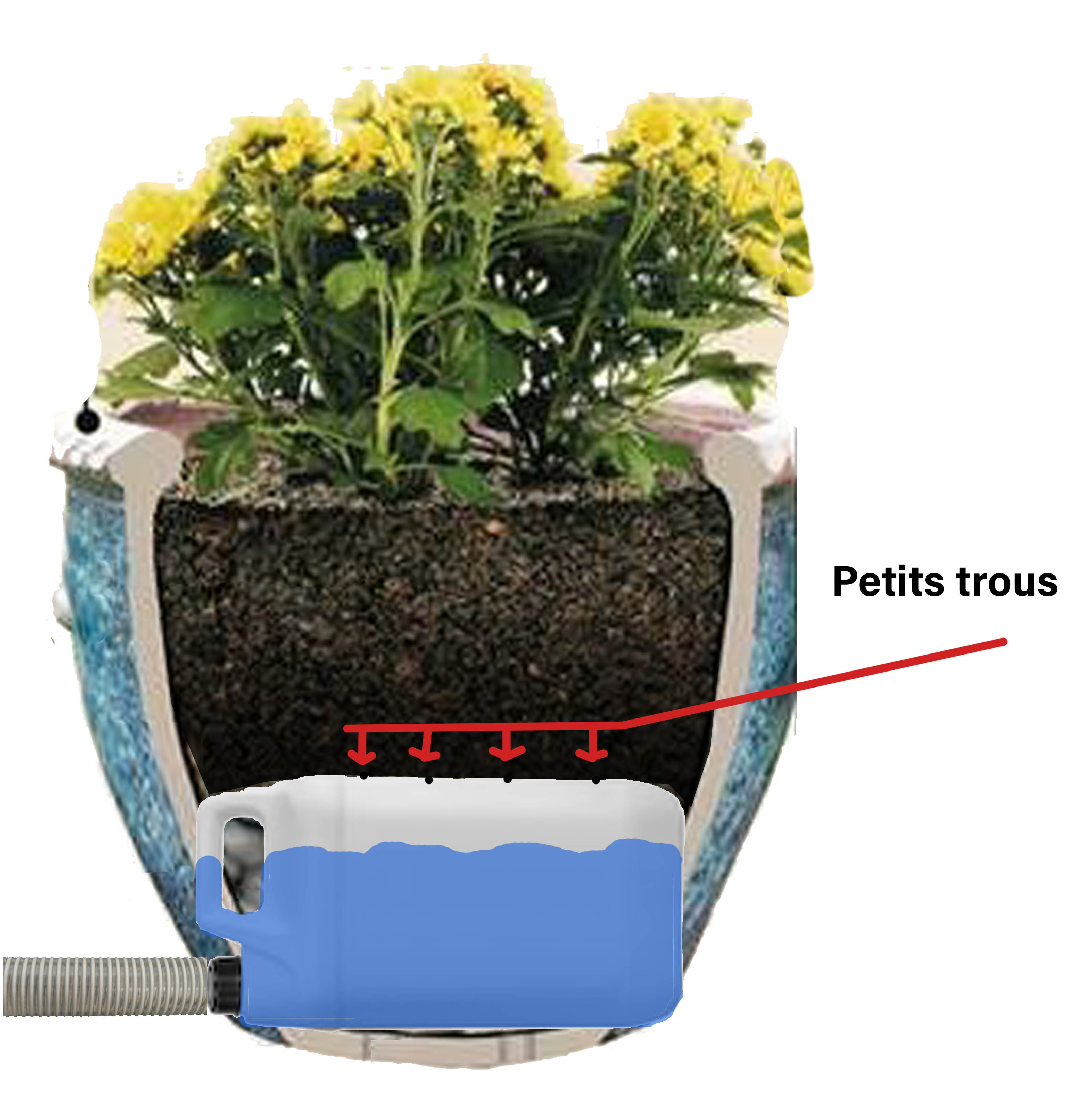 J’ai simplement mis des jerricans en plastique (reliés à un récupérateur d’eau sur gouttière) a l’horizontale et au fond de mes pots, c’est à dire sous mes plantes. J’ai percé 4 trous sur la partie supérieur et il semblerait que même quand le réservoir n’est pas plein et que l’eau ne déborde pas les plantes restent parfaitement hydratées : sur le dessus la terre à l’aire assez sèche mais en dessous la terre est bien humide.