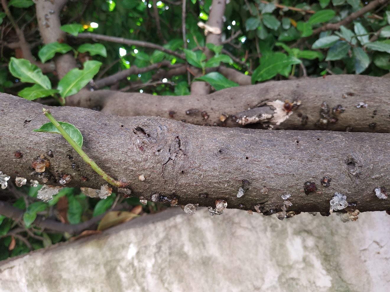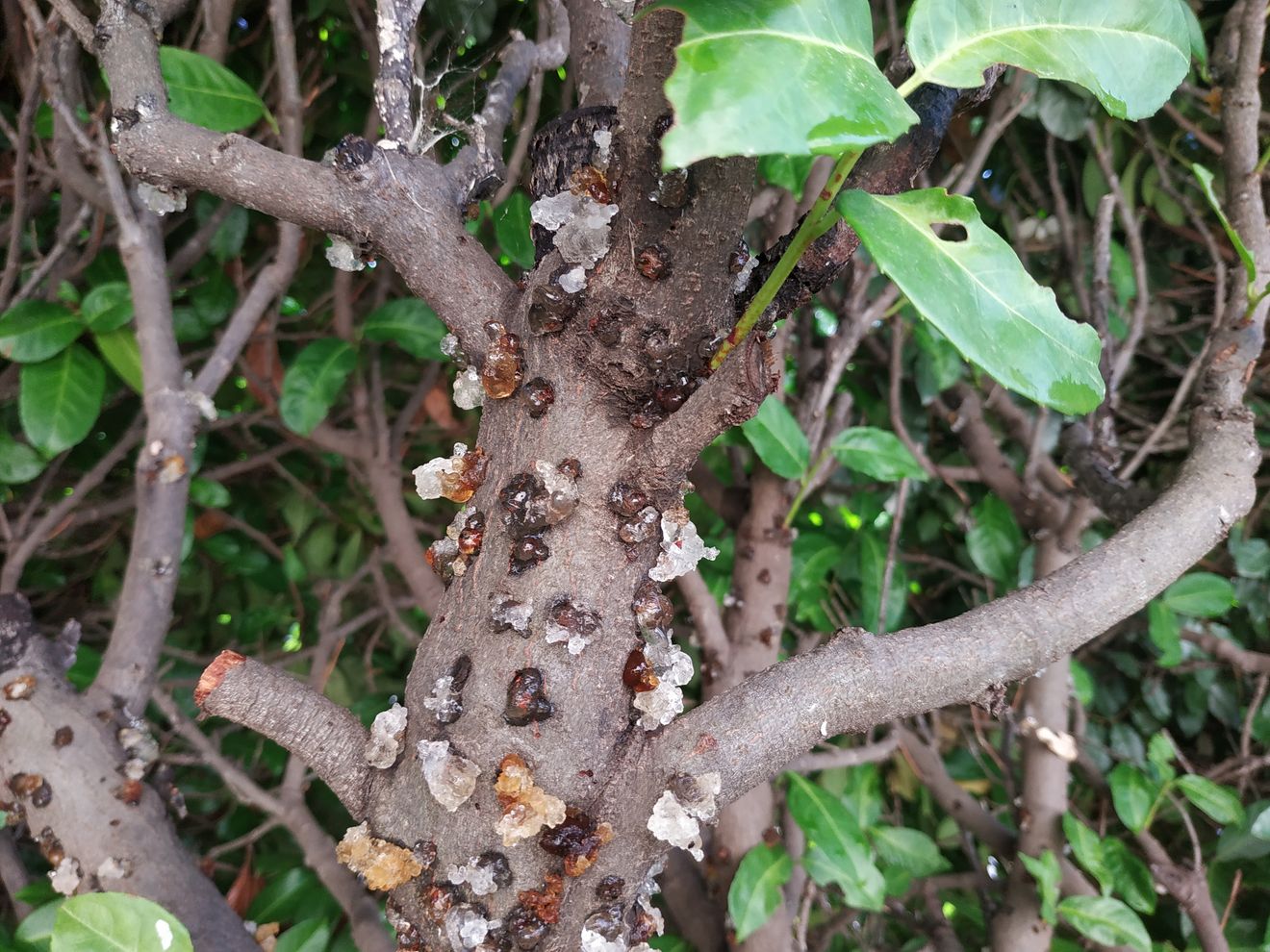 on voit sur les troncs des multitudes de boules de gommes blances ou ambrées et des trous dans les cotés des troncs exposés a soleil