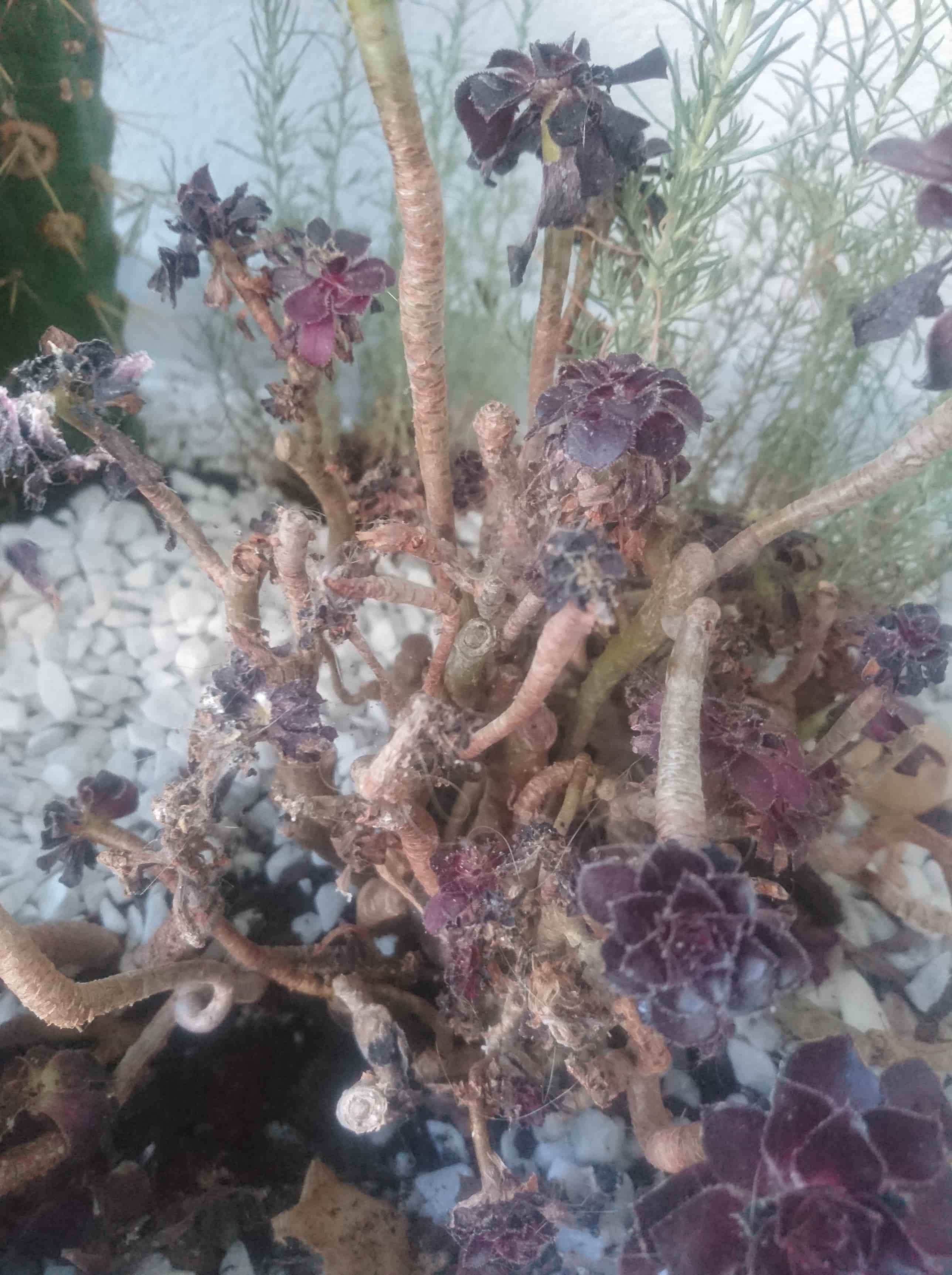 Ça ne m'étonnerait guère que ton Aeonium souffre de la concurrence, mais a mon avis y'a pas que ça. On remarque des points blancs, comme des cochenilles. Ça ressemble beaucoup à un assaut massif de ces saloperies. Tu pourra en déloger un max avec de l'eau, ou au coton-tige/alcool a 90. Ensuite traitement systémique.