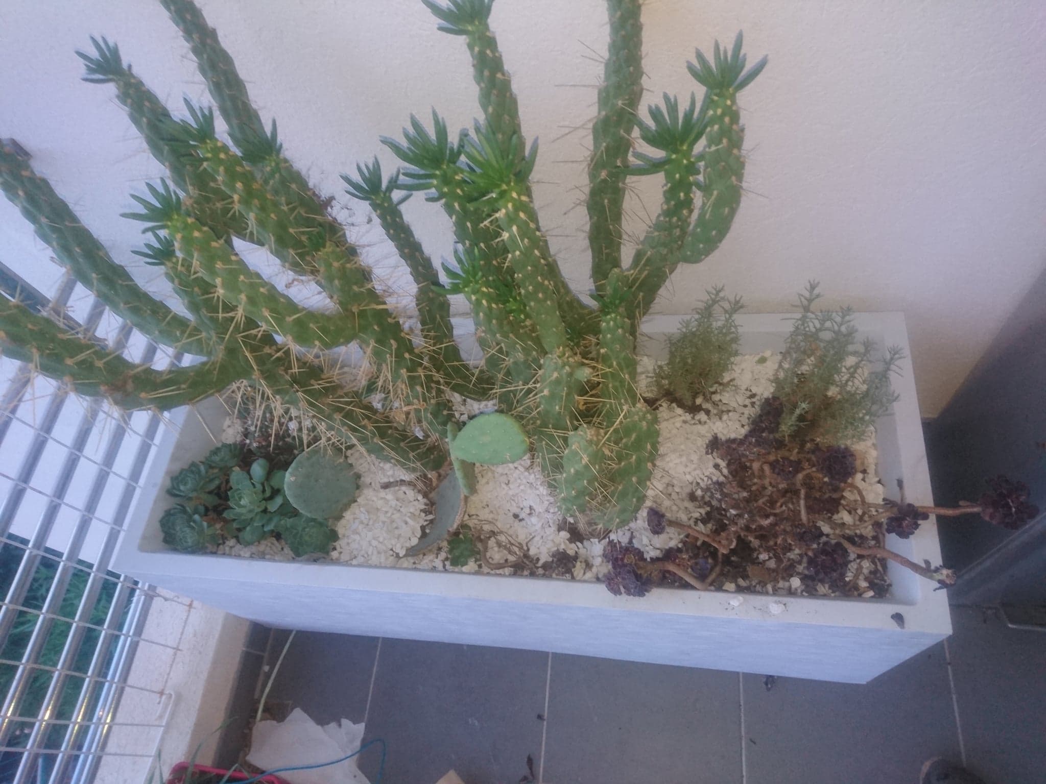 Je vous écris sur ce forum car j'ai un souci avec Aeonium arboreum, ses feuilles sèches beaucoup, voir elles semblent pourrir... Comme je le disais dans ma fiche de présentation je vis dans l'extrème sud de la Corse, mais le bac n'est pas en exposition direct avec le soleil. Mon Aeonium arboreum est planté dans un gros bac extérieur avec d'autres plantes grasses (voir photo ;) )