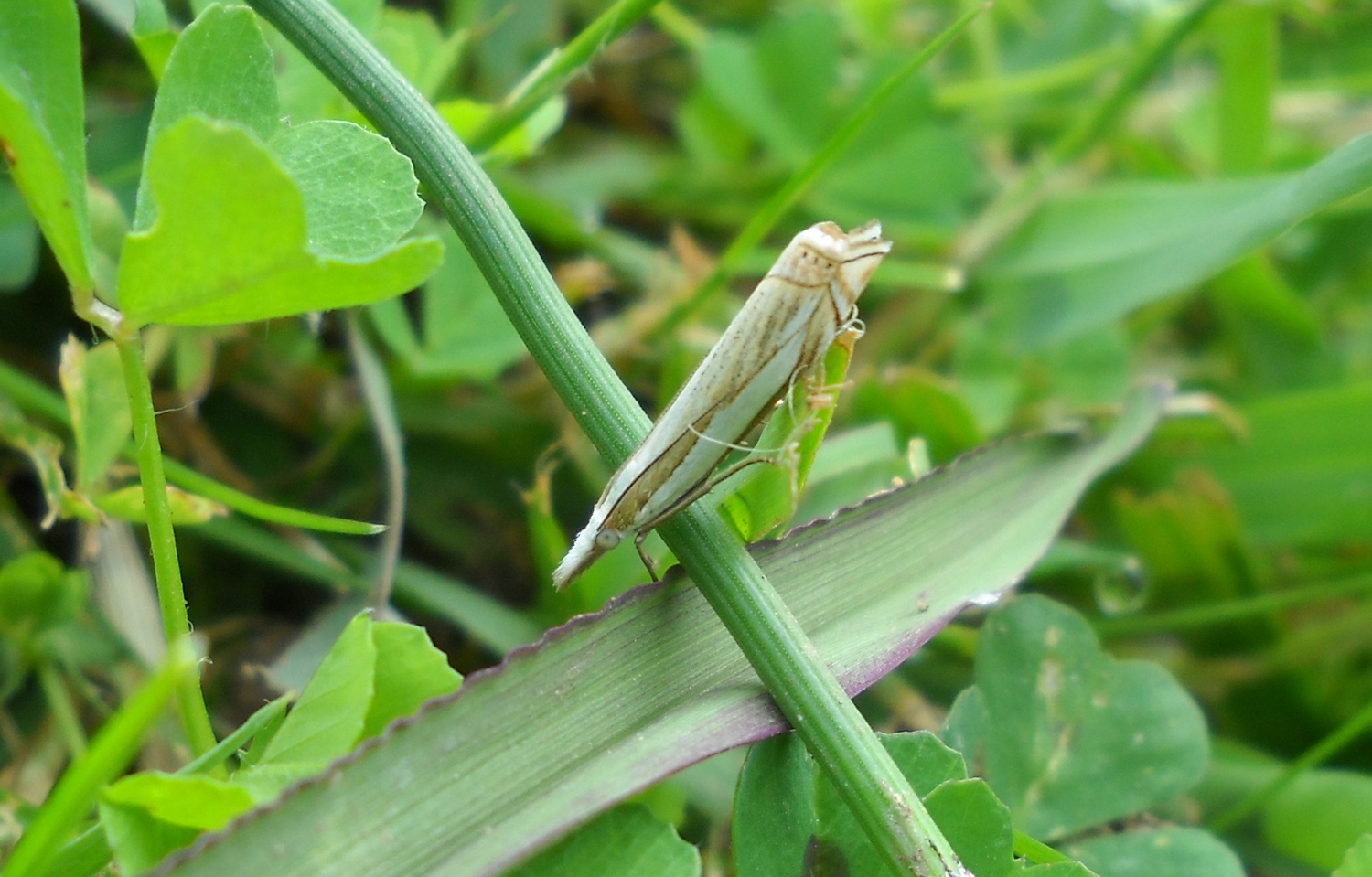 Je pense que le mien est aussi un Crambus lathoniellus; certains trouvés sur la toile ont cette couleur assez pâle avec ce trait noir caractéristique au bout des ailes me semble-t-il. J'ai dit blanchâtre car en vol on n'y voit que du blanc. :P