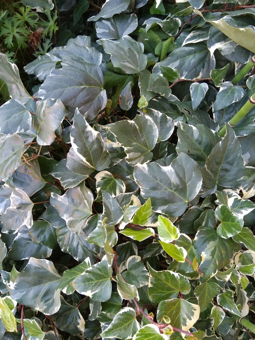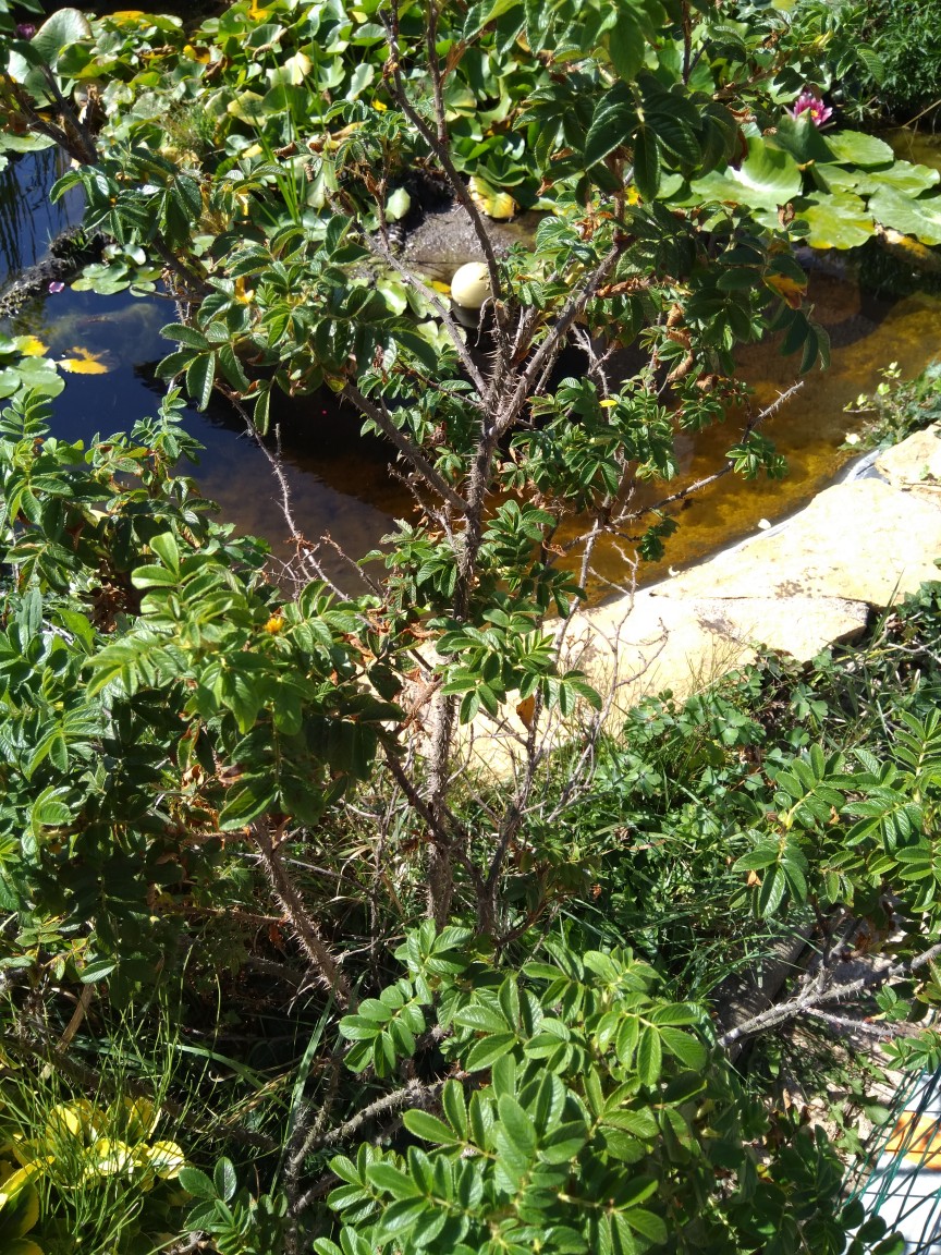 La plante à épines est rosa rugosa, puis lierre panaché, et enfin géranium vivace -il peut être blanc, ou violine, ou rose.