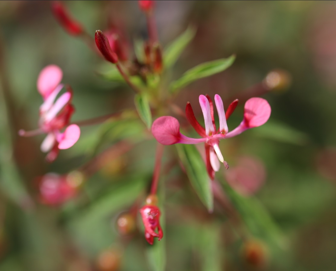 Cette plante s'appelle Lopezia racemosa, La fleur très petite fait penser à un moustique ou à un animal, elle est surnommée la fleur moustique. La plante mesure de 40 à 70 cm de haut.