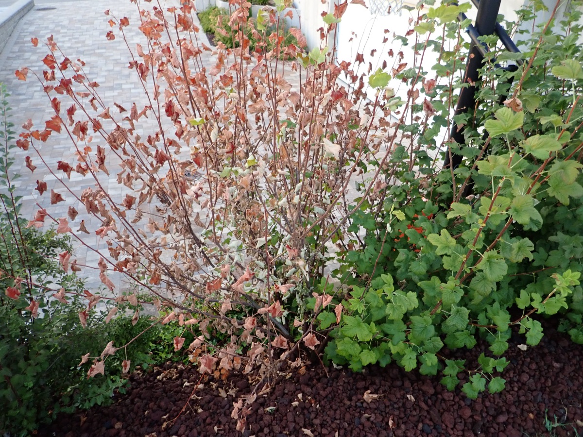 J'ai depuis le mois d’août mes Ribes perdent leurs feuilles. Deux sur trois, celui du milieu non. En début septembre se fût celui de droite.