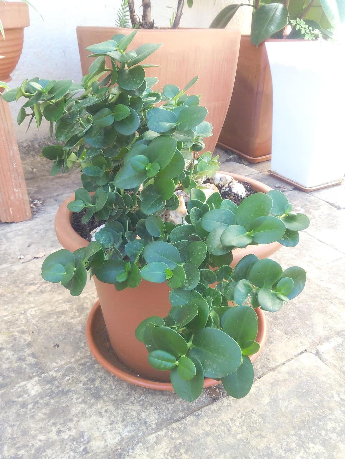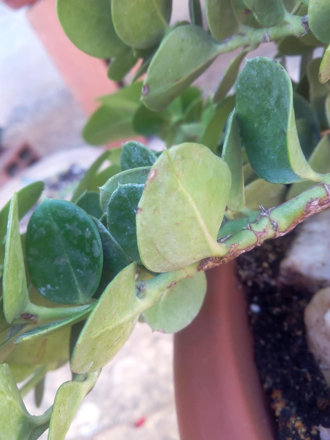 Bien que la seule fleur ne présente que quatre pétales, il me semble que ce doit être un Carissa (Apocynacées). L'espèce la plus courante est C. macrocarpa dont certaines variétés naines servent de couvre-sol. Fleurs très odorantes. Les Israéliens se servent depuis longtemps de Carissa pour fixer les dunes en bord de mer.