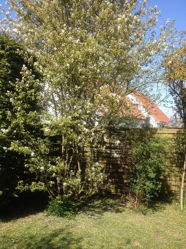 Mais l'amélanchier est un gros arbuste (pas un arbre), celui de 'jippap' pousse en touffe avec de nombreux troncs (ce n'est pas le cas de tous les sujets). Celui-ci se prête à l'éclaircissement et au renouvellement périodique de ses troncs, ce qui maintiendra une forme en touffe basse et une floraison plus dense . Le blanc particulièrement lumineux , à hauteur de l'observateur , sera mieux observable que s'il s'éparpillait dans le ciel.