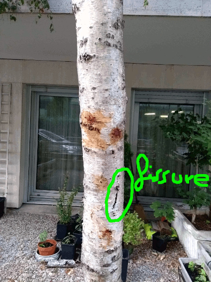 Il présente actuellement des taches couleur rouille sur le tronc et j’en suis inquiet; à coté d’une des tâches, est apparu, il me semble, une fissure légèrement profonde (maximum 8 mm de profondeur) ou alors je ne l’avais pas remarquée.