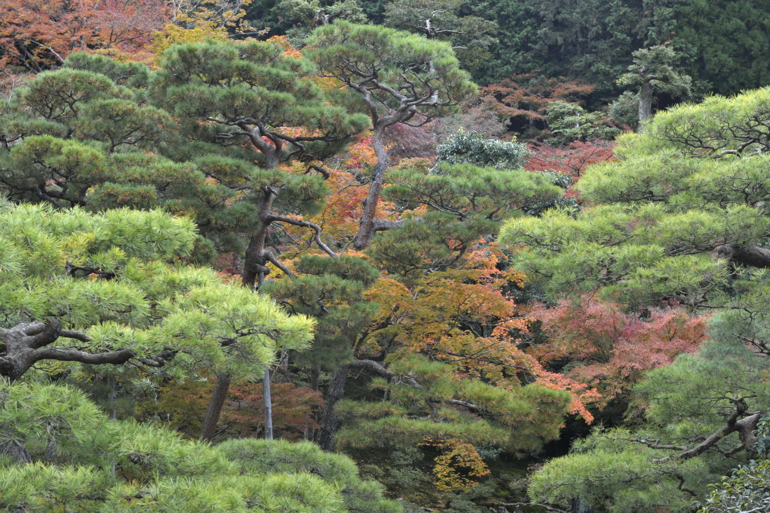 Au Japon, les Pins sont taillés car ils cassent lors des typhons tropicaux qui remontent du sud de aout à octobre. Les Pins ont besoin de lumière, ils montent et abandonnent leurs branches basses en vieillissant, une tempête brise le fut à mi hauteur, le pin ne repousse pas. (C'est ce qui s'est produit dans la forêt des Landes en décembre 1999).