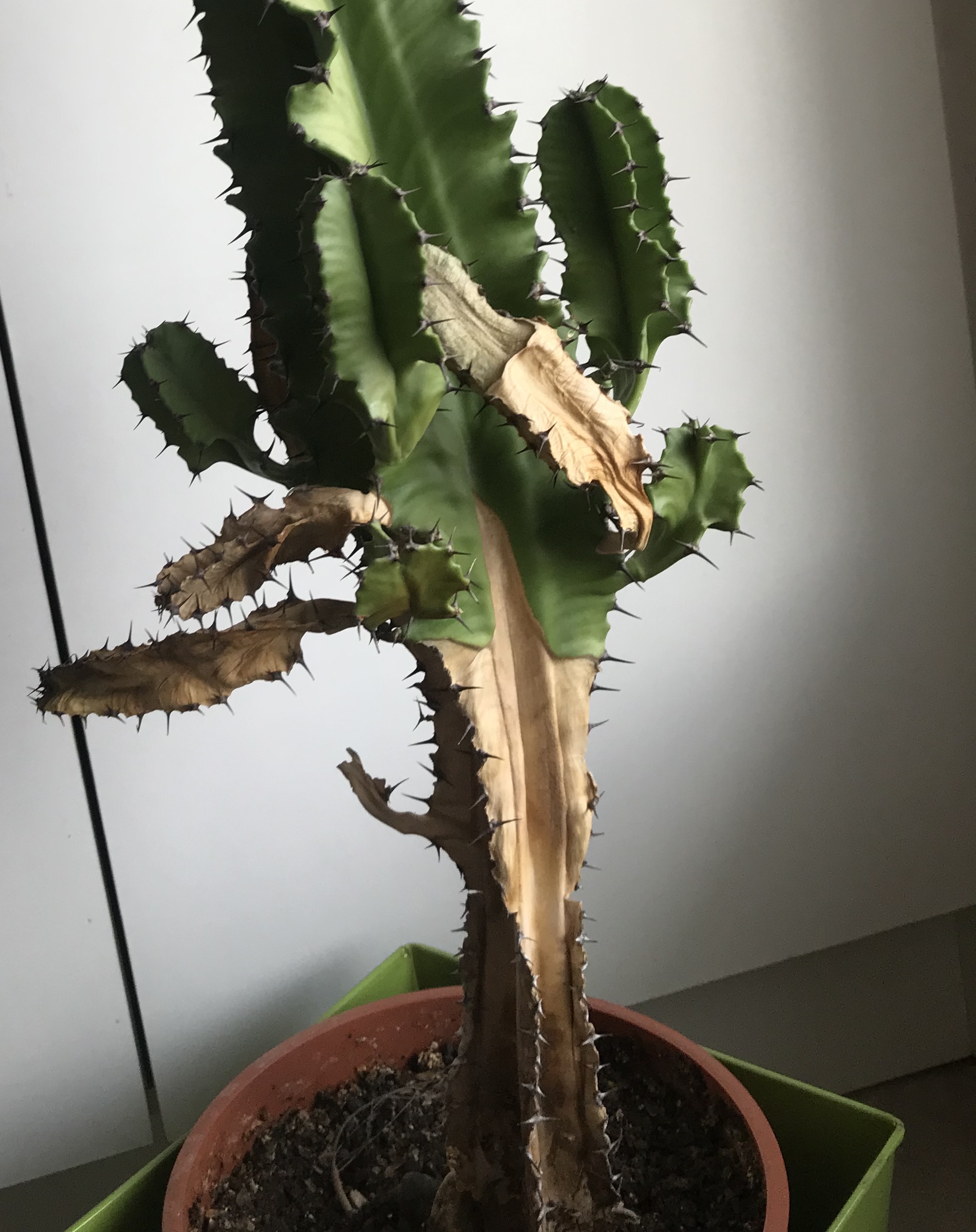 Attention au latex de l'euphorbe, qui est fortement irritant. Tu peux l'arrêter avec de l'eau. Coupe jusqu'à avoir des tissus parfaitement sains (sans coloration suspecte).