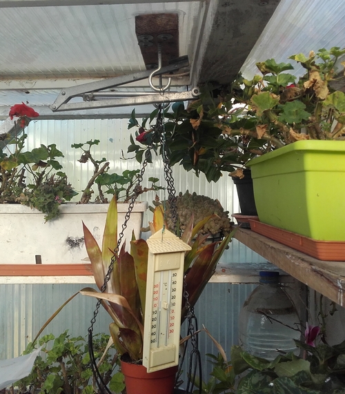 Le vérin n'est pas bloqué mais il est contraint. Avec ma méthode et suivant le poids de la plante je peux gérer l'ouverture quelque soit la saison ou la météo. En été il est totalement libre, au printemps et en automne c'est selon la météo et en hiver il est contraint afin qu'il ne s'active légèrement qu'à des moment de grosse chaleur afin de ne pas trop faire rentrer d'air froid de l'extérieur.