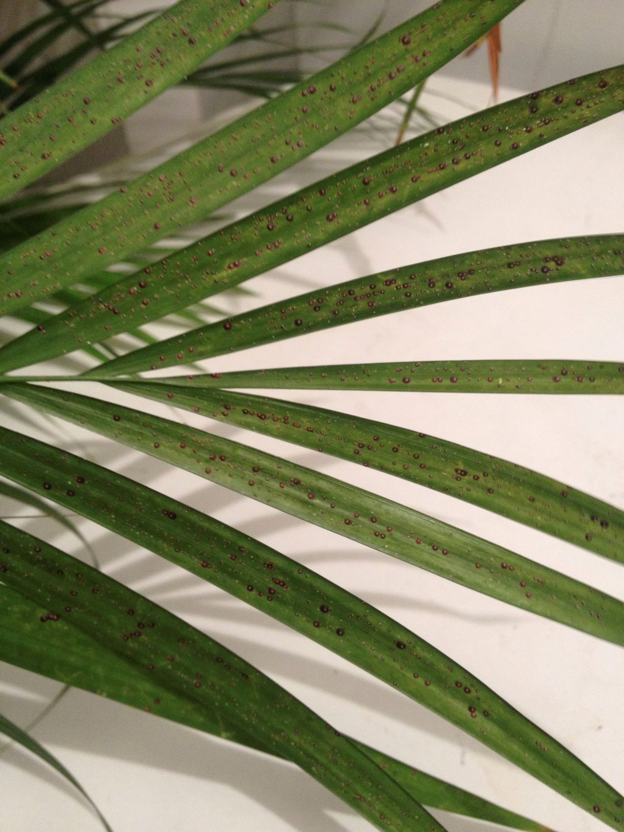 Je voudrais savoir ce que sont ces petites choses brunes. Elles sont bombées, avec un petit trou en leur partie centrale (qui apparaît comme un point blanc sur la photo). Elles sont sèches et se décollent quand on gratte avec l'ongle. En fait, on dirait des coquilles vides. Toutes les feuilles de l'areca ne sont pas atteintes.