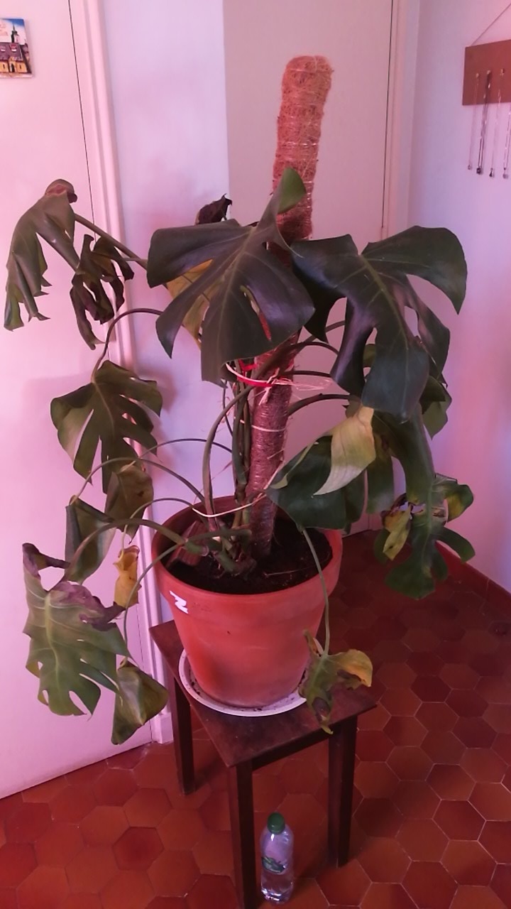 Je viens ici désespérée dans l'espoir d'éviter la mort de ma Monstera achetée il y a trois mois. Alors voilà je vis dans une chambre étudiante orientée plein sud, et j'ai déjà plein de plante en parfait état. J'ai donc décidé il y a trois mois de prolonger la verdure de ma chambre par une Monstera de taille moyenne achetée dans ma jardinerie préférée. Je l'ai donc rempotée avec du terreau pour agrumes (sans terre) et de l'amour dès l'achat comme conseillé, l'ai disposée à côté de ma fenêtre mais sans soleil direct, l'ai arrosée toutes les deux semaines... Deux nouvelles feuilles ont poussé, elle était magnifique, seulement l'hiver est arrivé... Et avec l'hiver le chauffage. Je me suis malheureusement rendu compte trop tard qu'elle était trop près du chauffage lorsque ses feuilles ont commencé à flétrir et à jaunir. Je l'ai donc déplacée il y a maintenant un mois. Sauf que voilà, son état n'a cessé de se détériorer depuis, de nombreuses feuilles sont tombées, et maintenant la plupart de ses feuilles sont soit flétries, soit jaunes, soit en partie noires. Je la voit mourir petit à petit et je ne sais pas ce que je fais de mal. S'il vous plaît, aidez moi à la sauver... Merci à ceux qui auront pris le temps de me répondre (je n'arrive pas à ajouter une image mais représentez vous une plante de taille moyenne mal en point dont les feuilles pointent vers le bas et commencent à s'enrouler sur elles mêmes et à noircir)