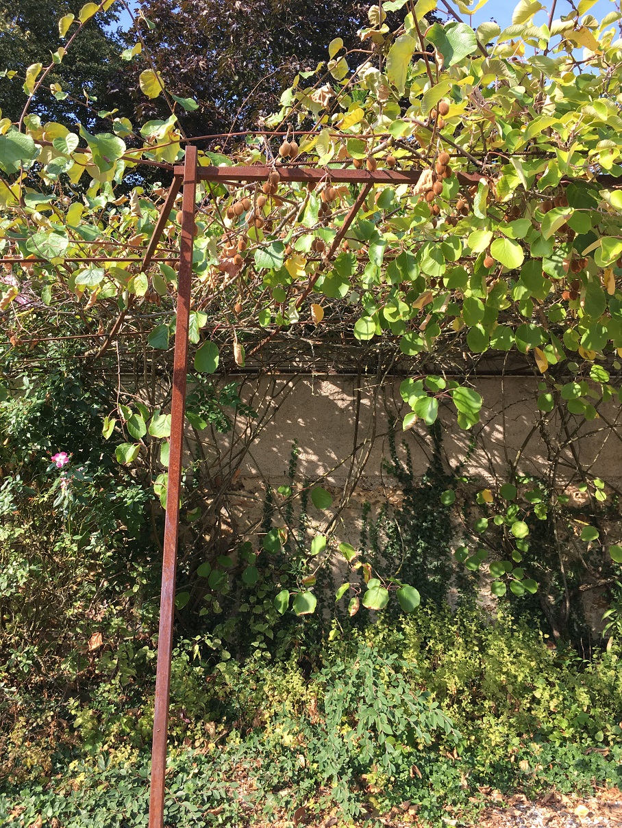 A titre d'exemple,en faisant la terrasse perchée en balcon sur ce site très pentu, on a planté un kiwi a chaque coin; deux a ras du sol et deux autres 3m plus bas; il leur a donc fallu un bon 5 m pour arriver au sommet de la pergola. Ça leur a pris a peu près le même temps qu'aux autres, je dirais que la troisième année tout était couvert; et comme l'arrivée électrique passait a trois bon mètres au dessus, ; ils y'avait des lianes qui s'érigeaient assez droites systématiquement vers ce cable. Vers juin,-juillet, on fauche tous ces "gourmands" (avec un long baton)