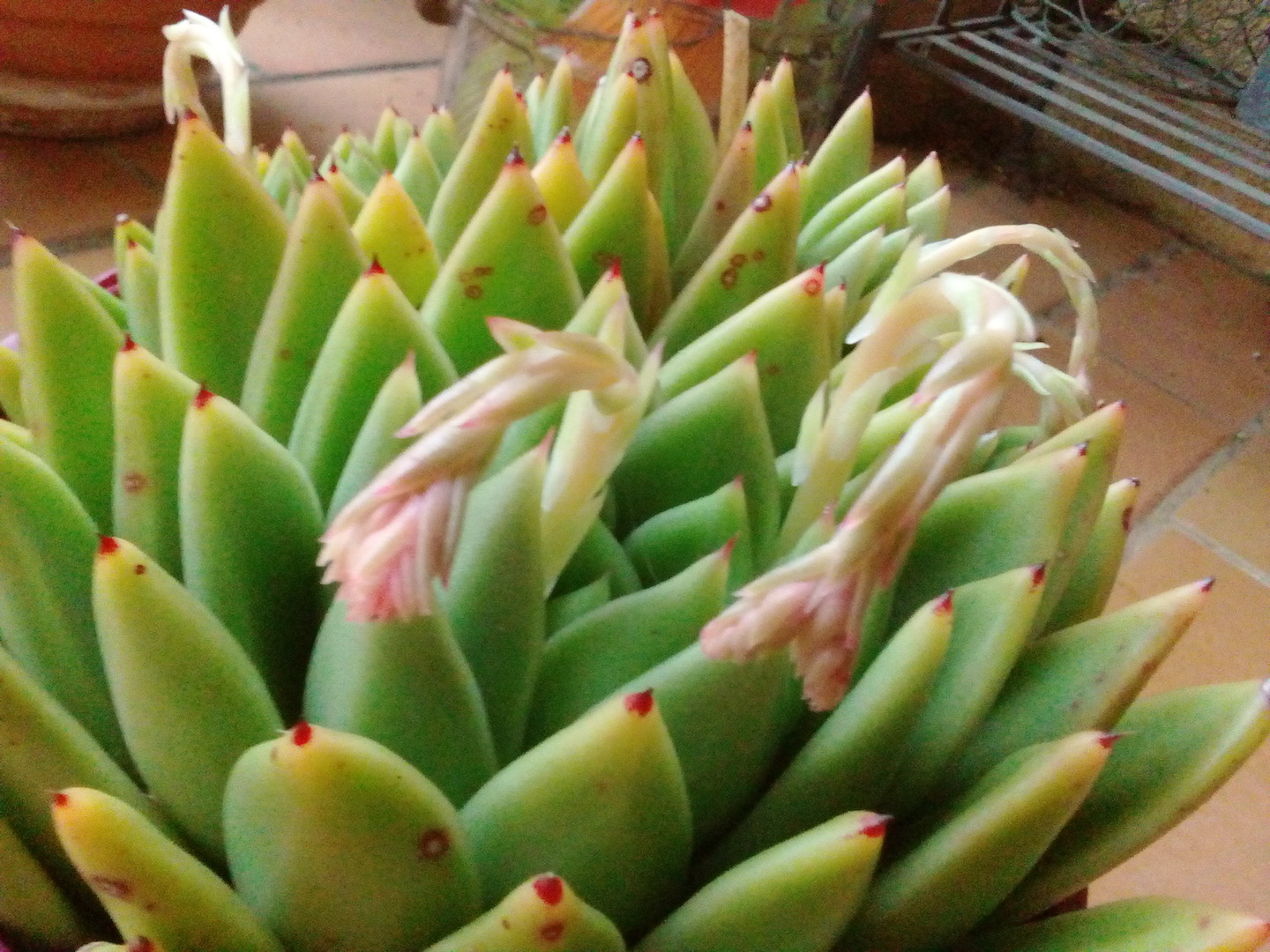 Voici la mienne, elle vit dehors toute l'année. Je pense qu'elle peut attendre le printemps pour être rempotée, meme si elle me paraît un peu à l'étroit....Elle vient d'une énorme potée de la voisine qui en a pris des morceaux , rosace par rosace....et ça n'a pas l'air de l'avoir perturbée dans sa croissance..Bon courage à SophieStiquet.