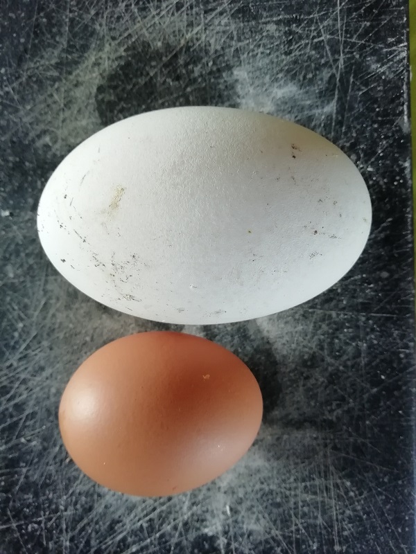 Plantation de 45 vitelottes issues de plants mis en terre l'année précédente. Pourquoi les piquets ? Parce que je compte essayer de faire monter les fanes le plus haut possible, un peu sur le principe de la tour à patates. Donc il y aura des cartons pour retenir la matière organique que j'ajouterai au fur et à mesure de leur croissance (j'ajouterai des piquets horizontaux pour tenir les cartons). Ensuite, j'ai découvert un carré qui était couvert par de la moquette tout l'hiver : en-dessous une terre très meuble (les pousses blanches que l'on voit sont des repousses de patates oubliées lors d ela précédente récolte), un petit coup de grelinette suivi d'un coup de griffe et c'était prêt à planter. Crosnes, ail et échalotes y ont pris place : Les crosnes en poquets par 3 ou 4 : L'ail est planté sur les sillons afin d'éviter les excès d'humidité de notre climat. Au fond, j'ai recouvert les crosnes de fientes d'oie, de fougère broyée comme paillage et enfin de ronces pour que les merles et les lapins n'aillent pas fouiller dedans. Activité d'une matinée de pluie : écraser les os de seiches ramassés lors des promenades de Bidoche au bord de la mer, un gros sac a donné environ 5 litres de poudre, les restes iront aux oies ça leur fera un apport de calcaire. Et ça tombe bien parce qu'elles ont commencé à pondre. Une oie ça ne pond pas beaucoup, mais quand ça pond ça ne fait pas semblant ! 61g pour l'oeuf de poule, 164g pour l'oie !