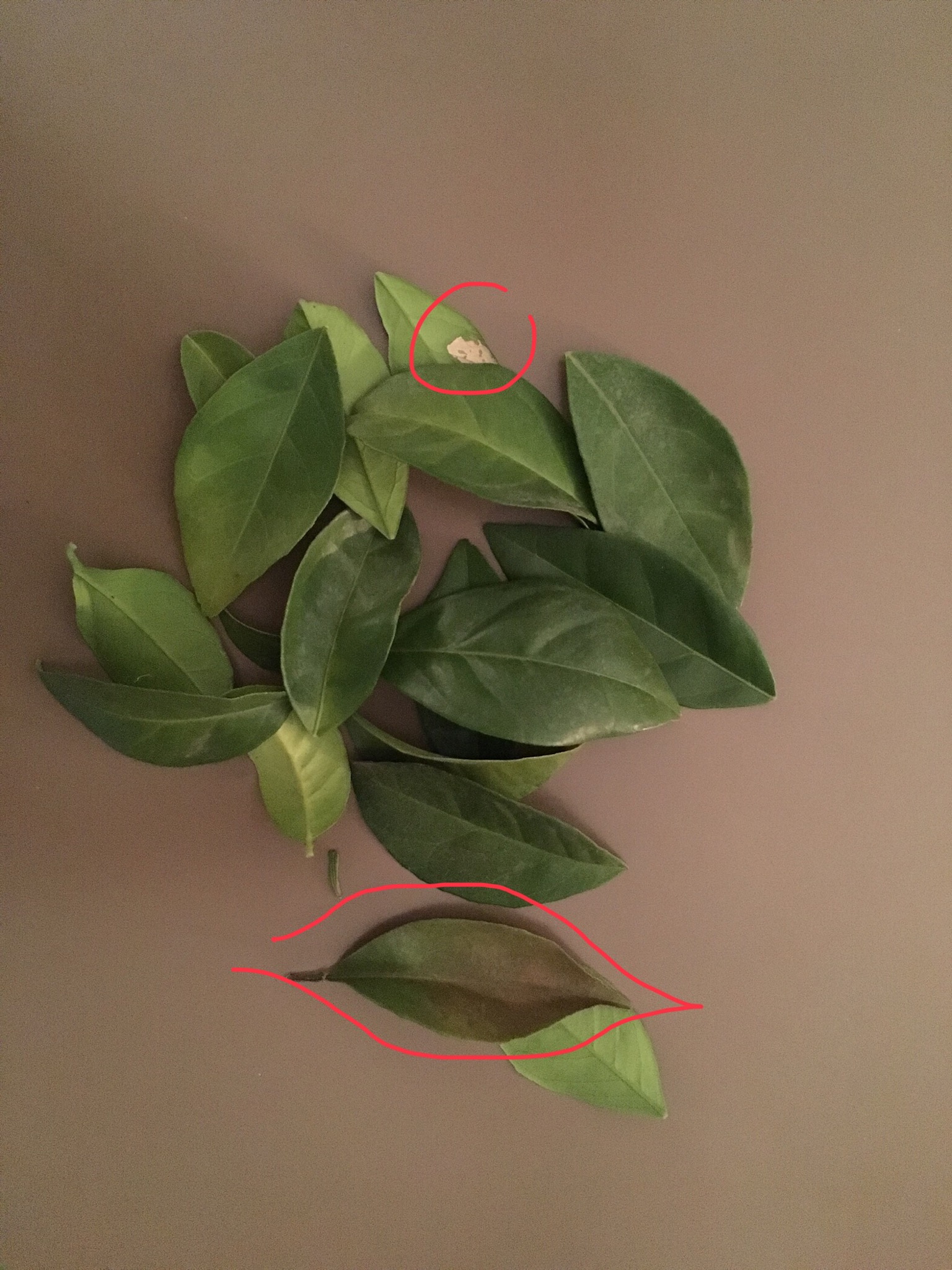 > Pourquoi les feuilles tombent elles? elles sont pourtant vertes et « rigides » (hormis quelques visiteurs, entouré en haut, et une feuille marron parce que tombée dans la terre, en bas)