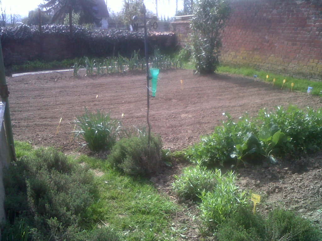 C’est rigolo, entre deux giboulées, la neige fond rapidement sur l’herbe. En revanche, dans mon petit potager, chaque carré de terre retournée, prête aux semailles et aux plantations,