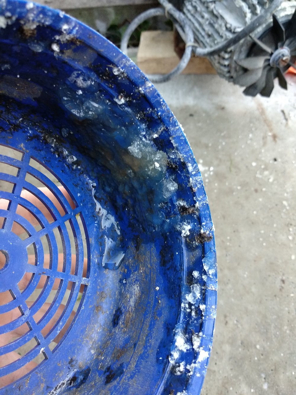 1- Le champignon : une matière visqueuse, voire gélatineuse s'est agglomérée sur les ailettes du moteur. J'imagine qu'elle est rentrée dans le moteur car celui-ci est grippé et ne démarre plus tout seul (j'ai pu le faire tourner en faisant tourner l'arbre mais le temps de l'opération je voyais de la fumée sortir, j'ai tout arrêté). Cette matière ne dégage pas d'odeur et on remarque des tâches blanches. On dirait presque du givre. Est-ce que ça pourrait être de la mérule ? et sinon ?