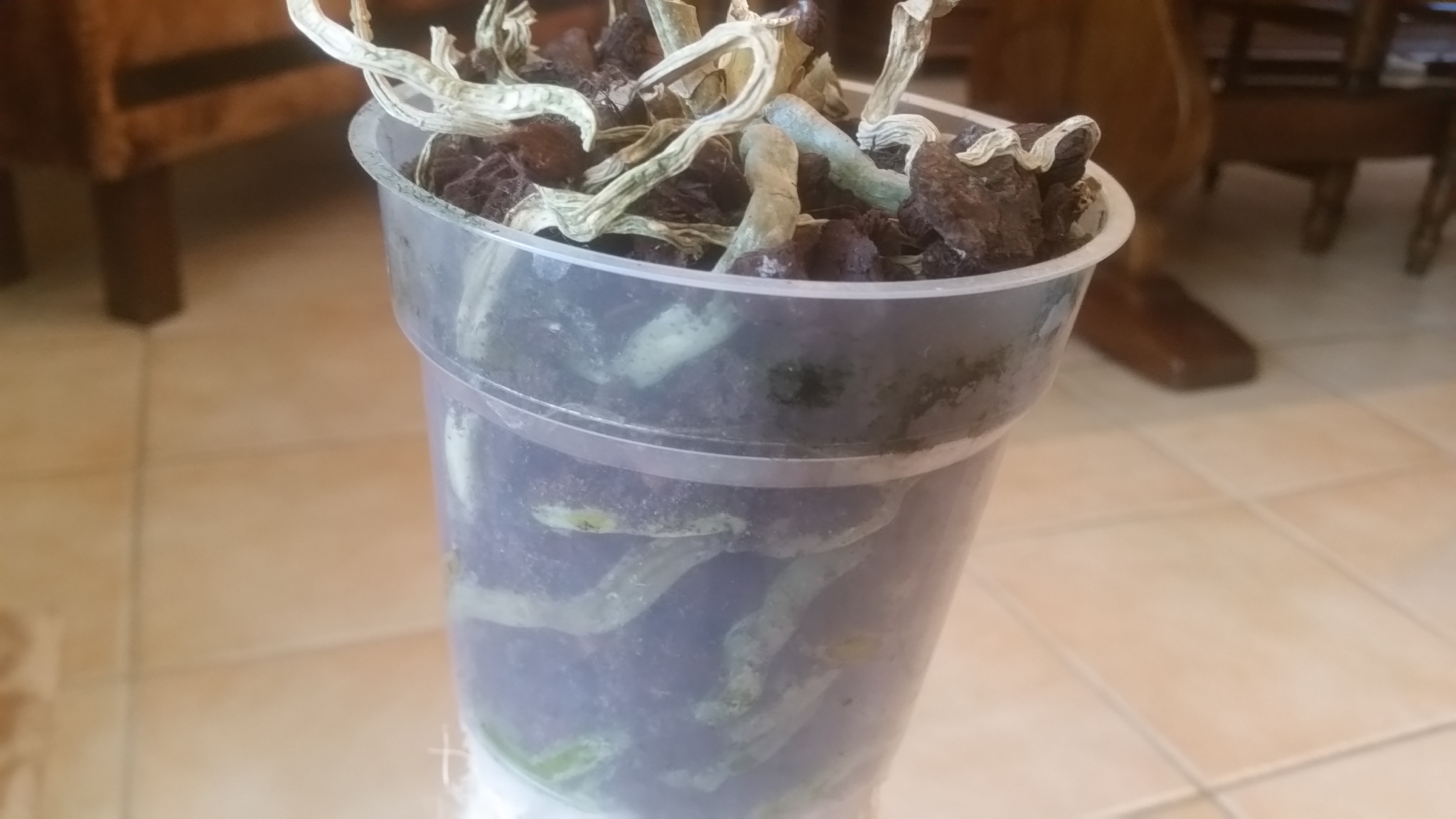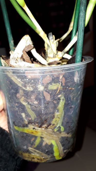 Pour les racines, l'importance c'est que le corps de l'orchidée soit toujours vert. si il tout est noir c'est que tout est pourri. Et les racines vertes sont certainement pourries à la base et finiront par pourrir complètement..