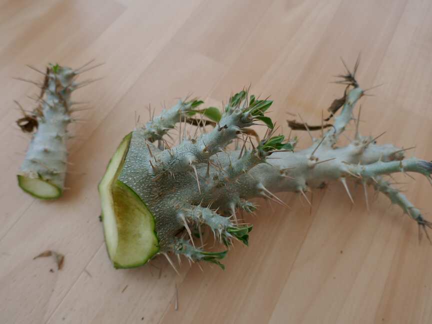 J'ai une succulente dont j'ignore le nom. Elle a un gros tronc un peu ramifié, de très fortes épines et de petites feuilles vertes.