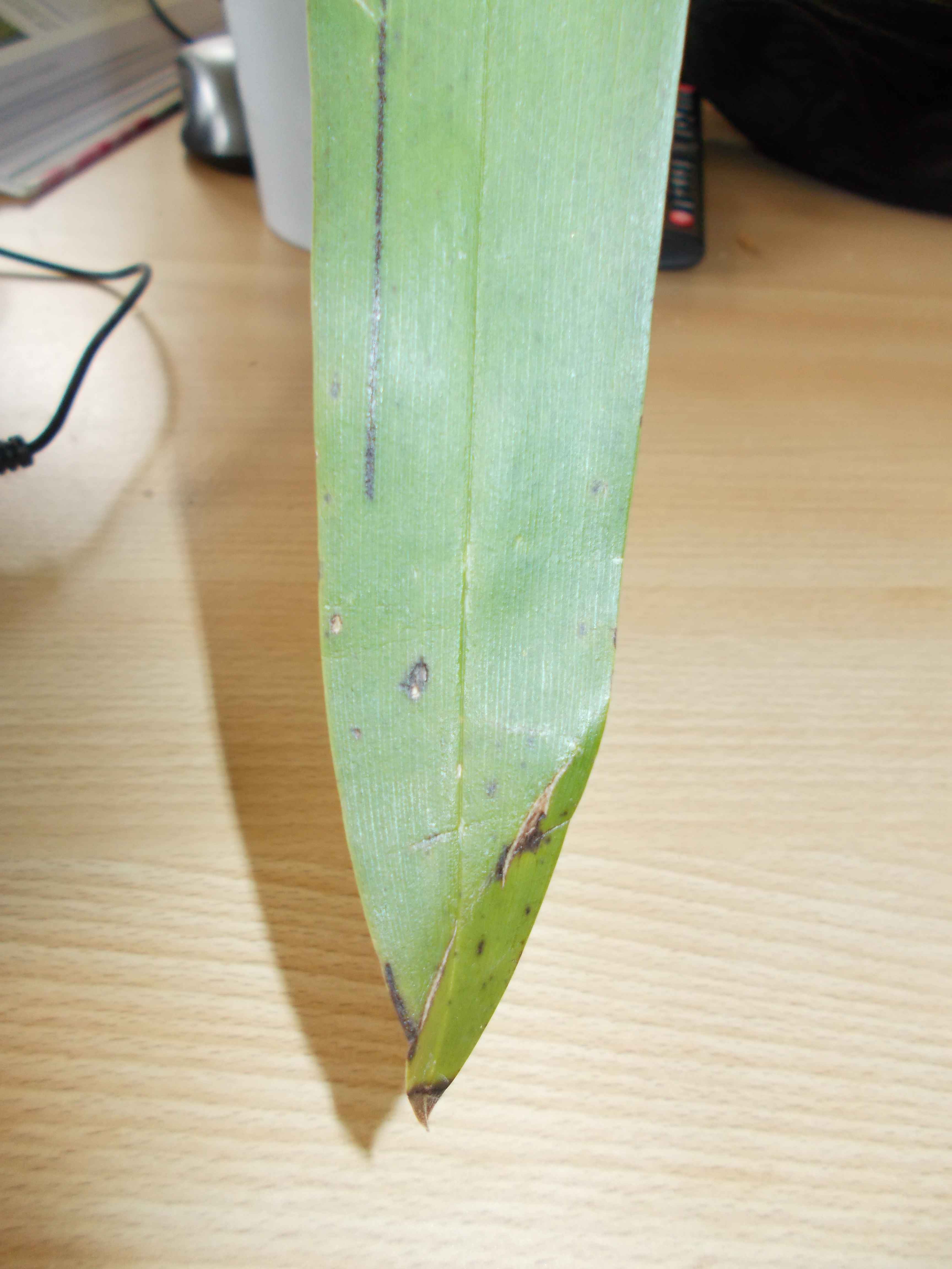 La feuille d'orchidée ressemble à une vieille feuille en fin de vie qui dans le processus normal de la plante va finir par jaunir puis tomber. Si ce n'est pas le cas (jeune feuille ou toutes les feuilles comme ça) : cette orchidée a très très soif, il est urgent de l'arroser.