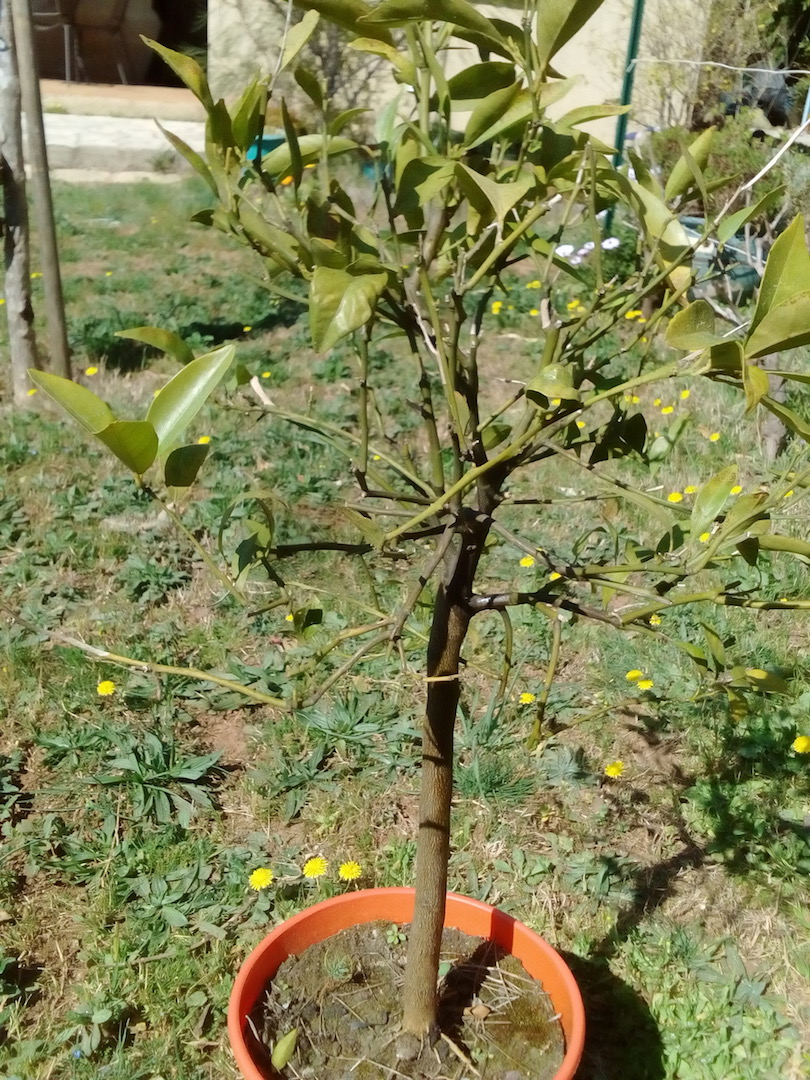 Au vu de la taille du pot par rapport à celle du tronc, ne faudrait-il pas le rempoter plus au large et "dépeigner" les racines ?